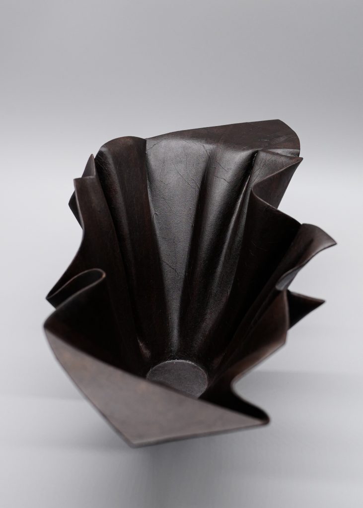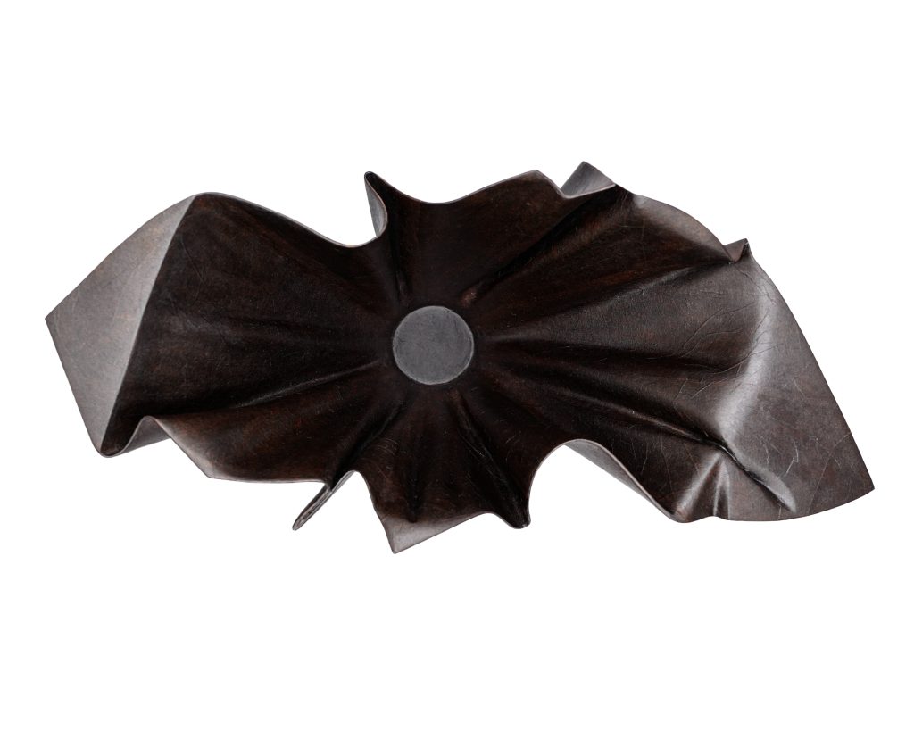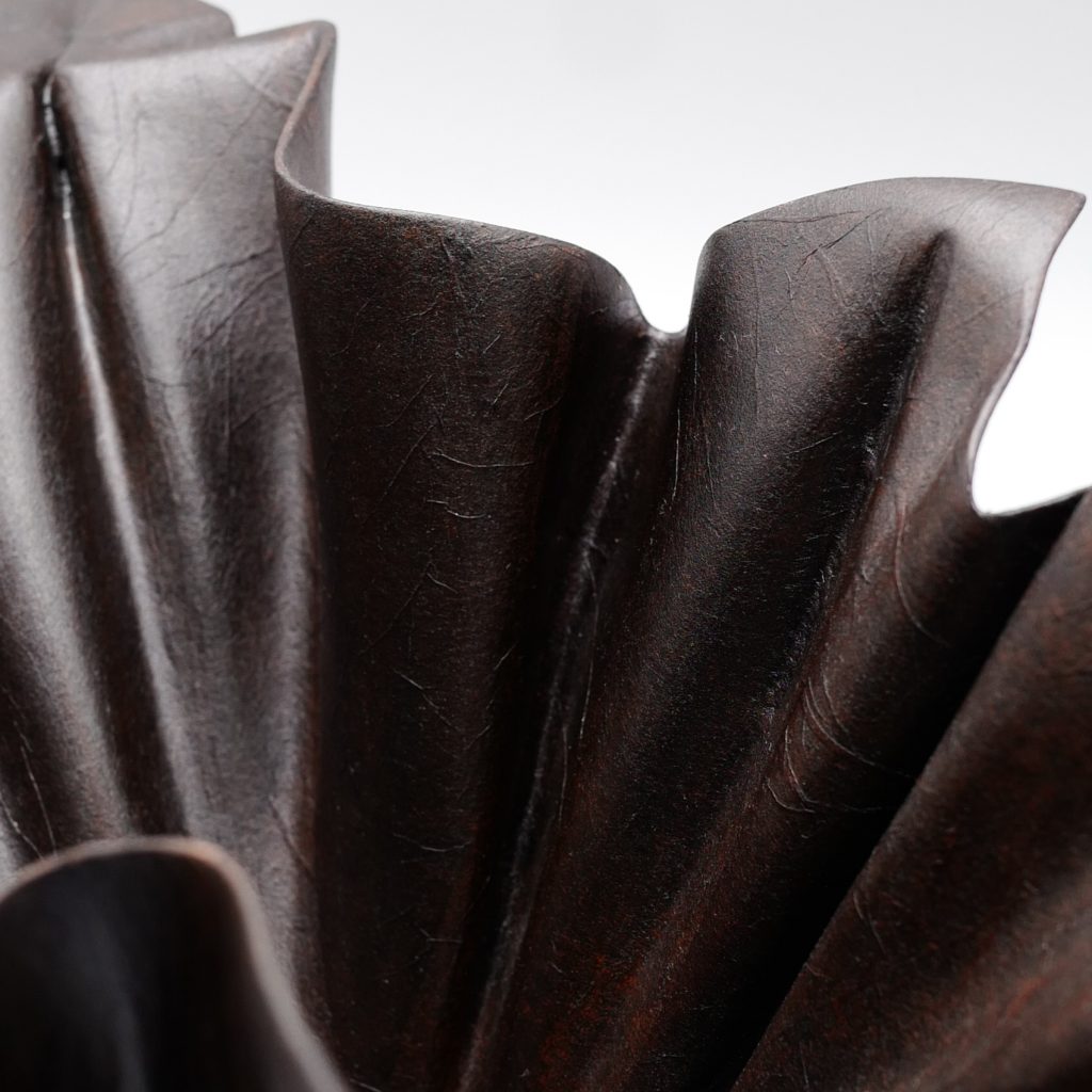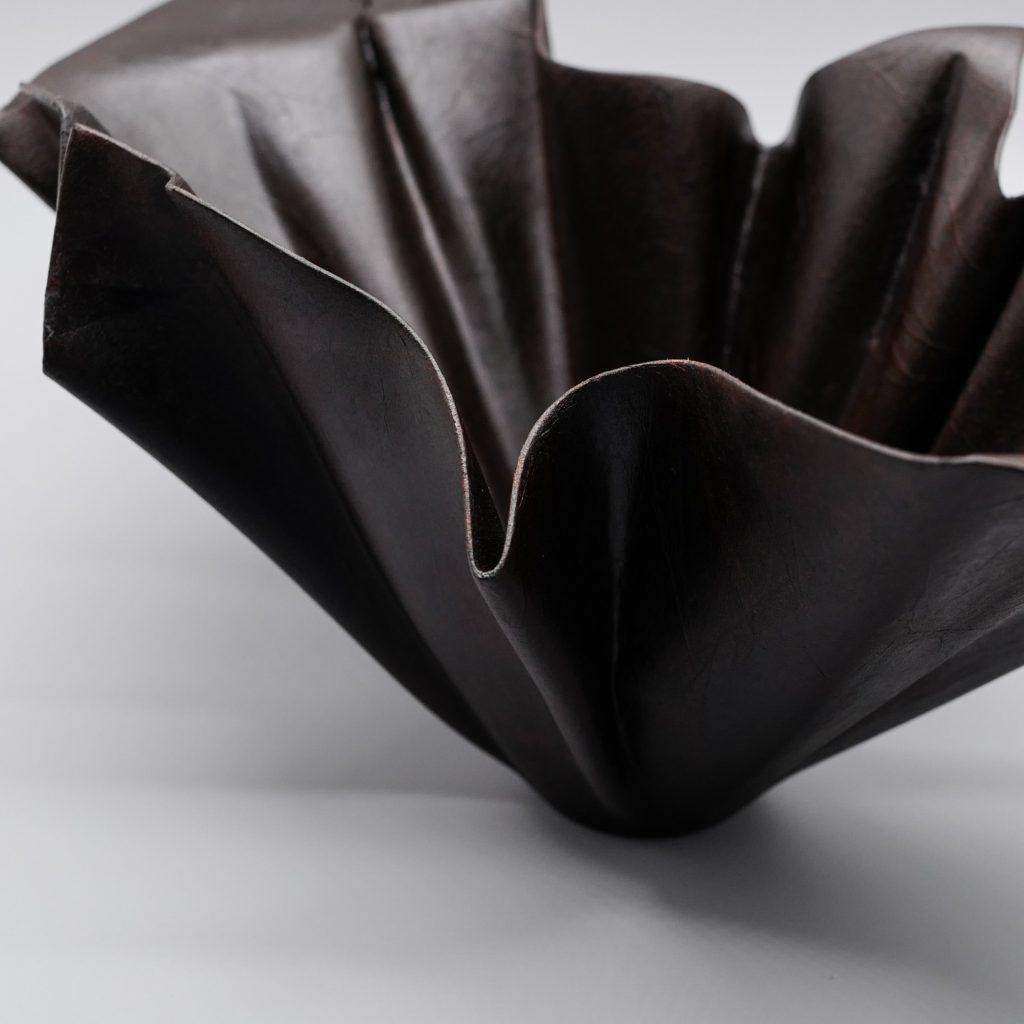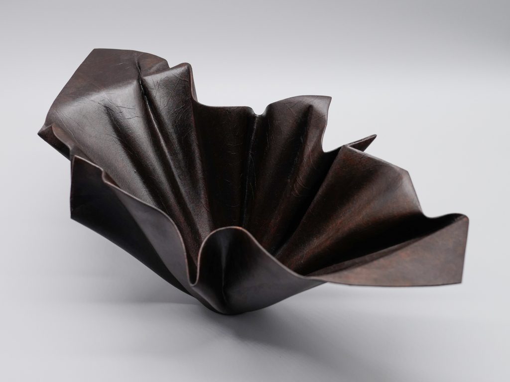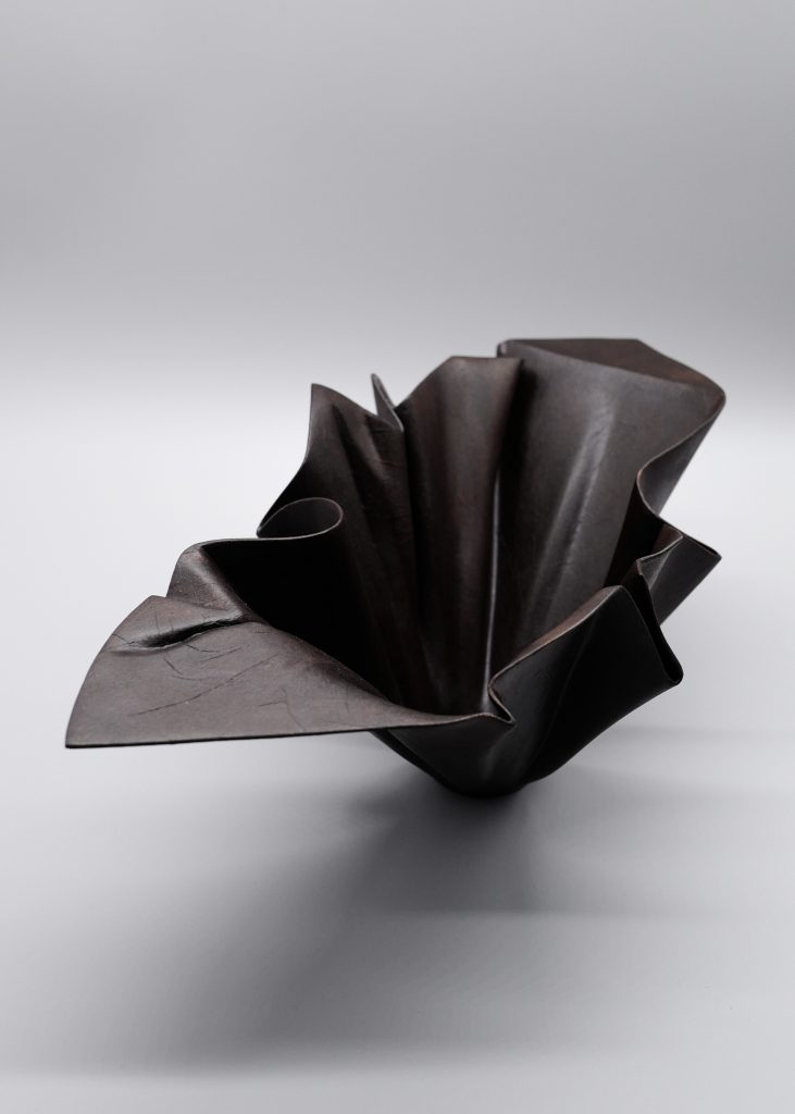 The Artist: “This piece is created using the patented leather technique of traditional lacquer art, taking advantage of the softness and flexibility of leather, and with the concept of origami as the entry point to create three-dimensional form. The entire work is fixed with lacquer and Japanese washi paper, giving it a gentle and soft texture while keeping the authentic appearance of the leather. It blends perfectly with the shape of the work, just like the moment when the breeze blows.”