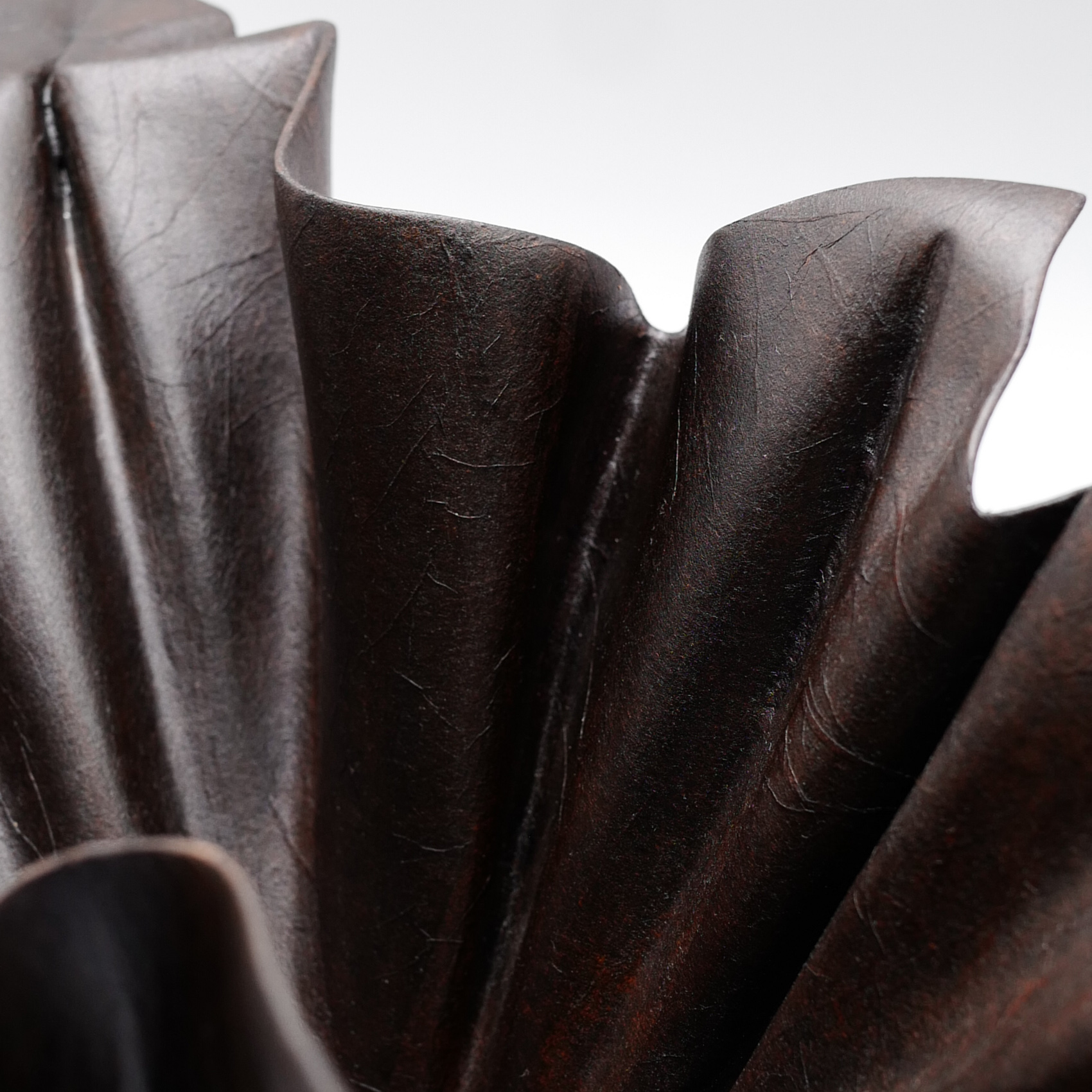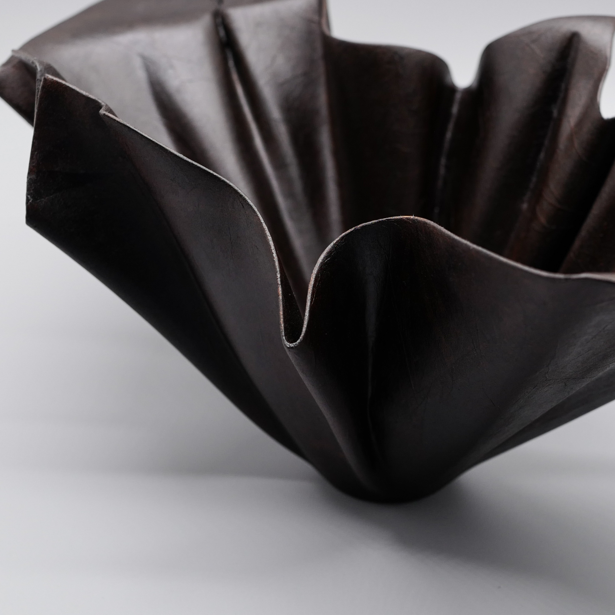 Wei Nan uses various forms of leather for her works. The expression of her works are sometimes determined by the intrinsic nature of the leather she is working with. The laborious process starts with form foundation. The leather is vigorously hand-stretched into its intended form and held in shape by applying base layers of raw lacquer extracted from the lacquer tree. The fiber proteins in the leather will fully absorb the lacquer and begin to stiffen. This process is repeated 3-4 times to intensify the hardening of the leather. Hemp cloth or linen are then layered on several times to make shape stronger. Ash powder of varying fineness, jinoko (coarse) and tonoko (fine), are applied together with lacquer onto the surface 5 times consecutively. Jinoko and Tonoko are commonly used traditionally in restoring lacquerware. This is then followed by an average 3 layers of primer with each layer being sanded down to silky smooth and blemish-free surface before applying the next layer. Final layers of lacquer are then painted on, sanded and polished to achieve complete smoothness and lustre shine.